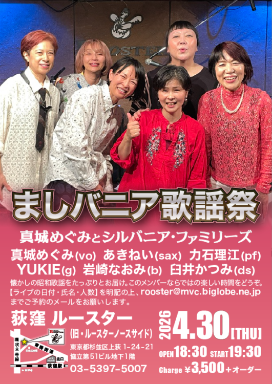 出演:真城めぐみ(vo)とシルバニア・ファミリーズ…あきねい(sax) 力石理江(pf) YUKIE(g) 岩崎なおみ(b) 臼井かつみ(ds)